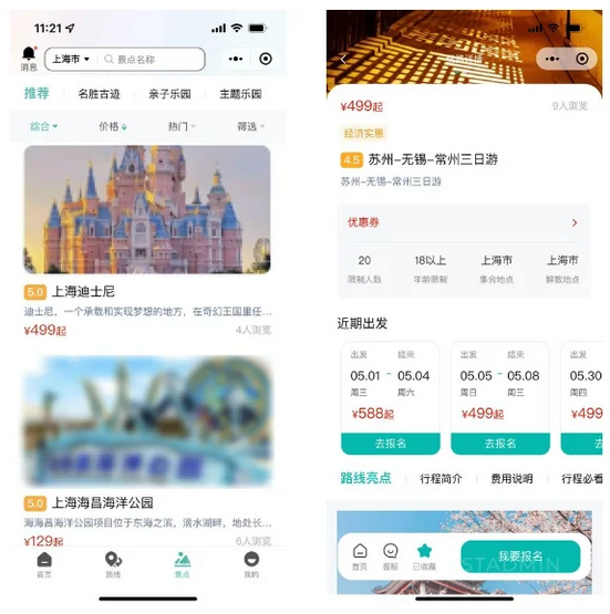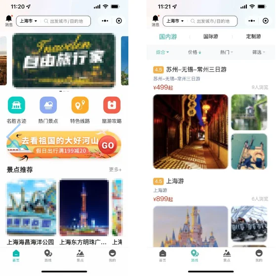 1、旅游线路:旅游机构可以发布旅游线路,用户选择对应的出行日期(不同日期价格可能不一样),支持持价和儿童价两种价格,在线购买,生成订单和核销码