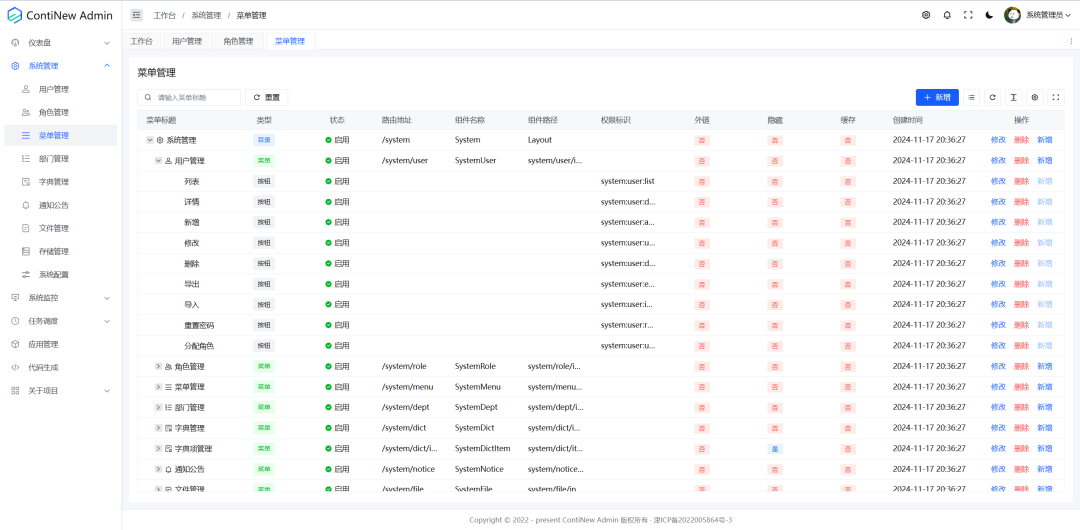 - 丰富的内置功能:路由权限管理、动态菜单、标签页导航、国际化、主题切换等一应俱全。