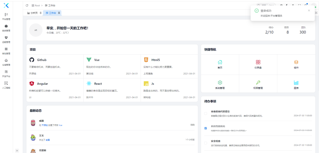 功能齐全:集成了SAAS、多租户、RBAC权限控制等核心功能,满足复杂业务场景需求。 -