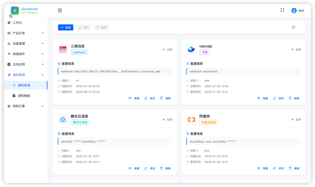 通知管理:多渠道支持(钉钉、阿里云、腾讯云、webhook、邮箱、飞书)。 -