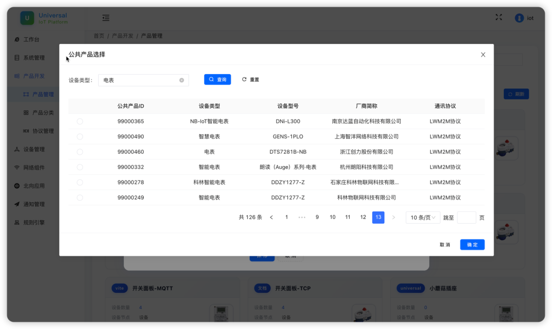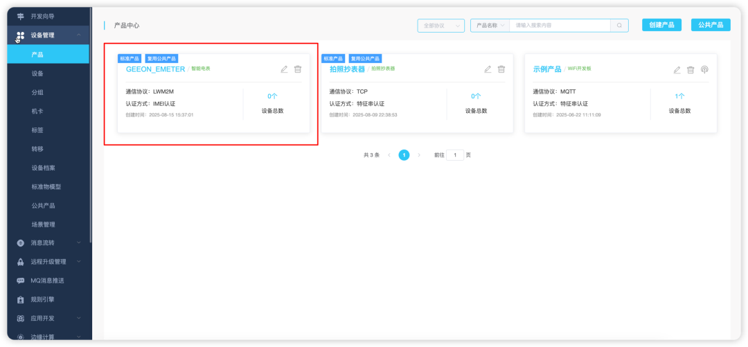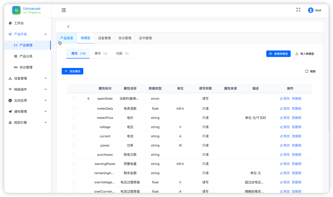 产品管理:多协议产品创建、物模型定义、产品标签、公共配置。 -