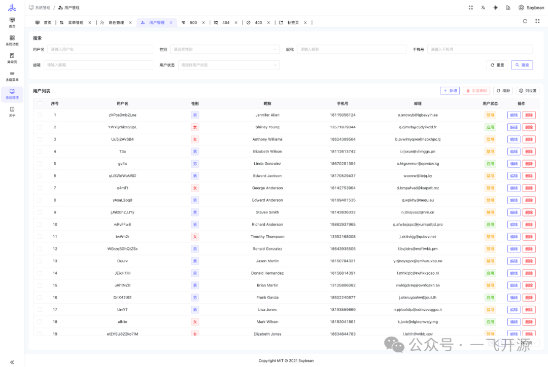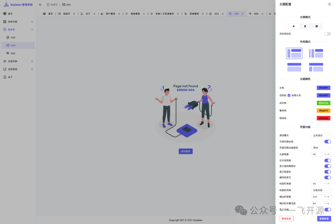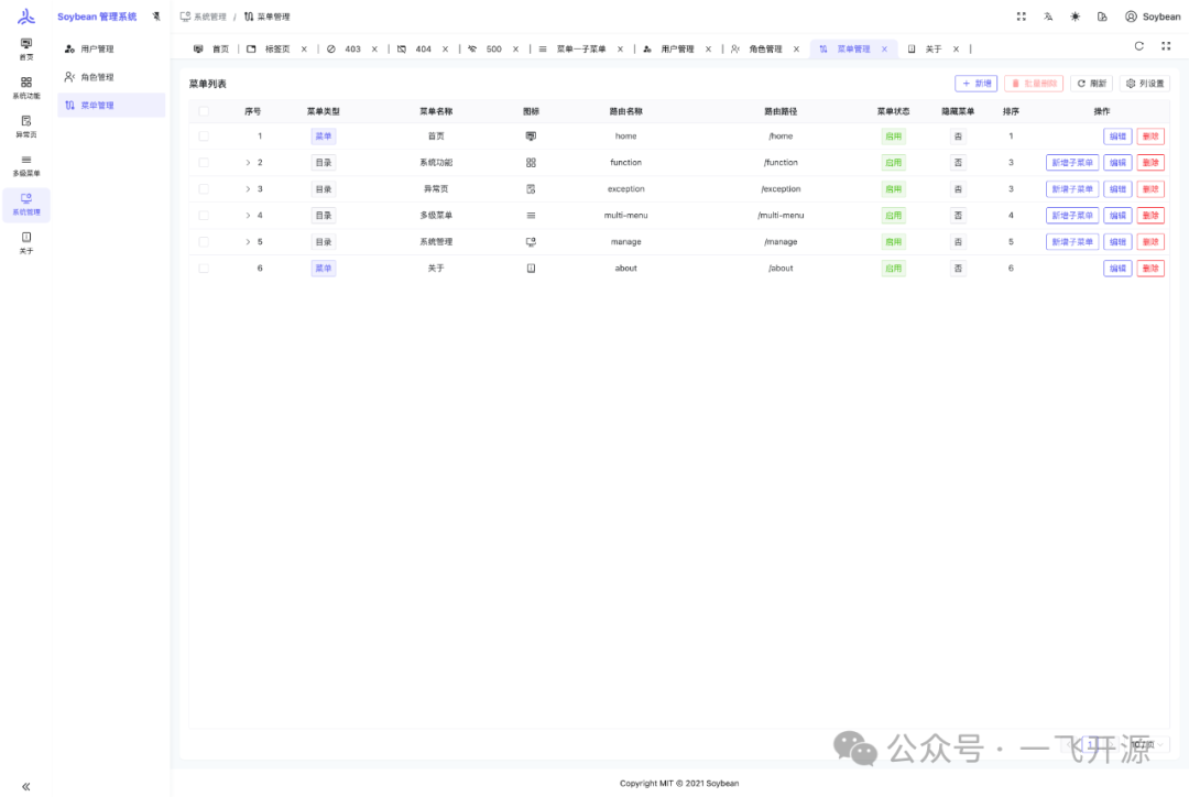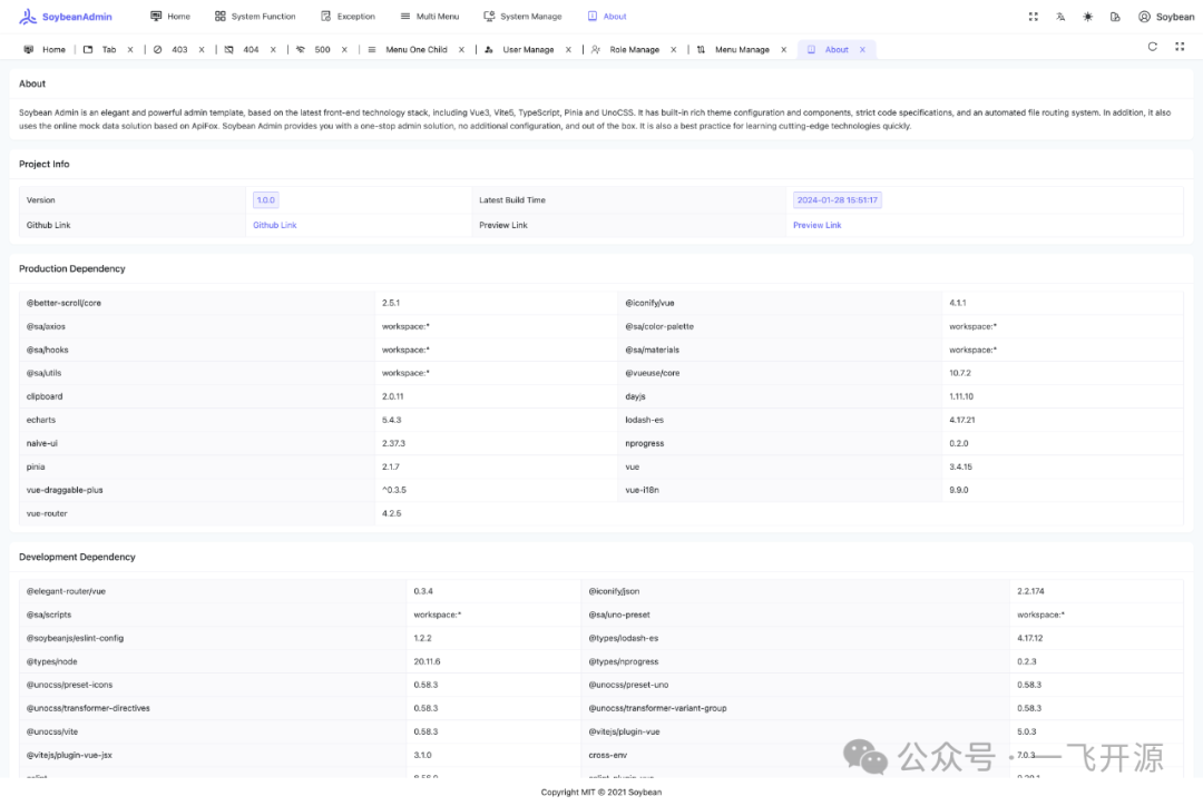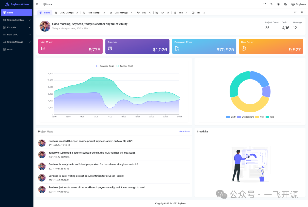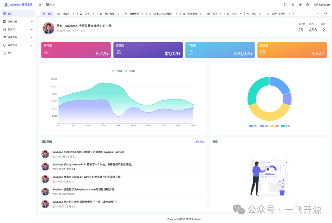SoybeanAdmin 是一个清新优雅、高颜值且功能强大的后台管理模板,基于最新的前端技术栈,包括 Vue3, Vite7, TypeScript, Pinia 和 UnoCSS。它内置了丰富的主题配置和组件,代码规范严谨,实现了自动化的文件路由系统。此外,它还采用了基于 ApiFox 的在线Mock数据方案。SoybeanAdmin 为您提供了一站式的后台管理解决方案,无需额外配置,开箱即用。同样是一个快速学习前沿技术的最佳实践。