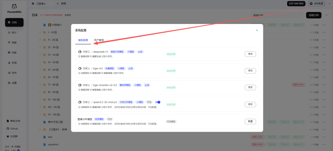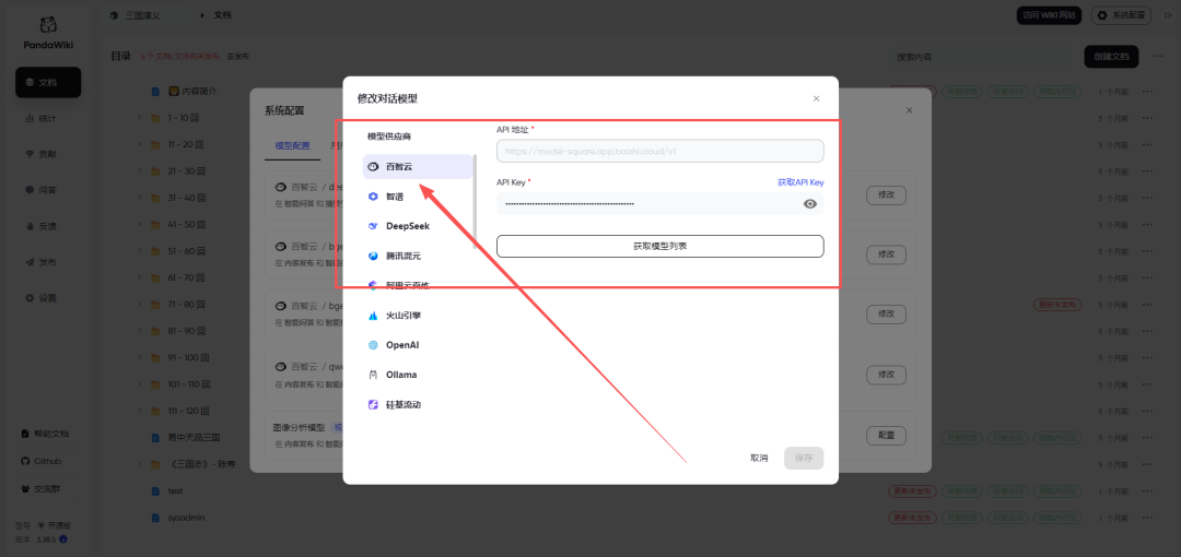 在登录 PandaWiki 后台后,我们可以前往系统配置中配置模型,目前 PandaWiki 支持接入的大模型供应商如下: