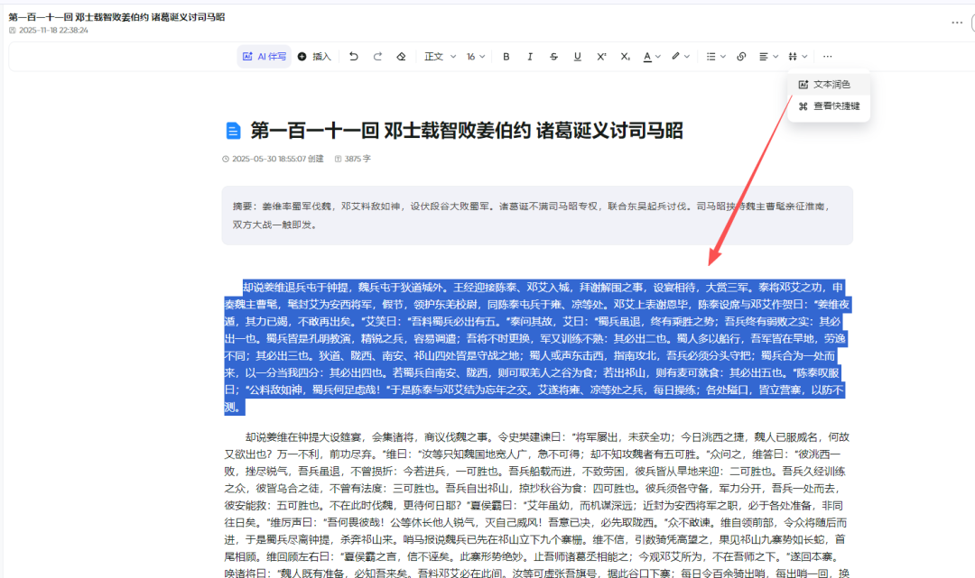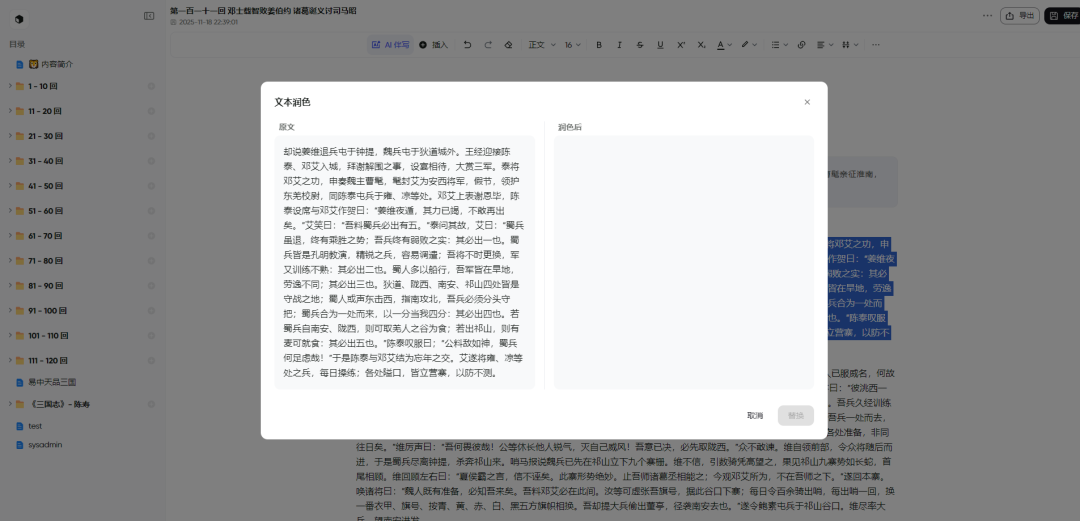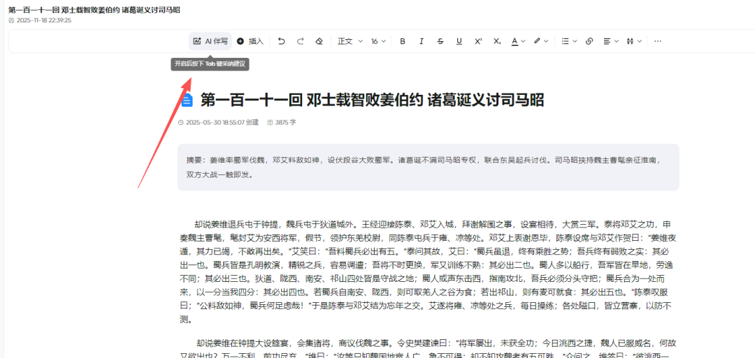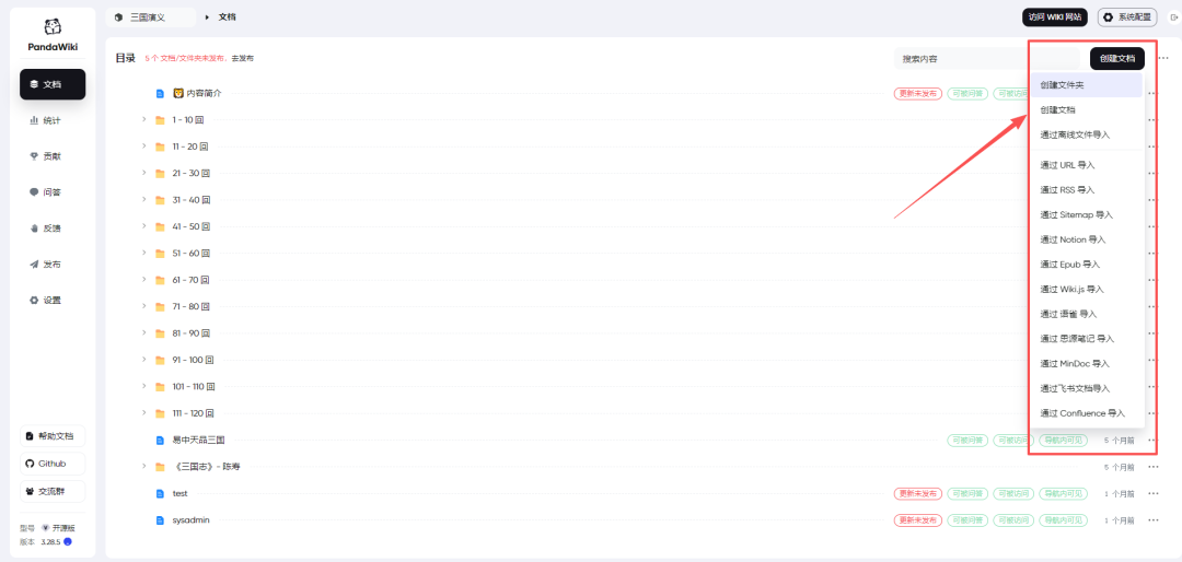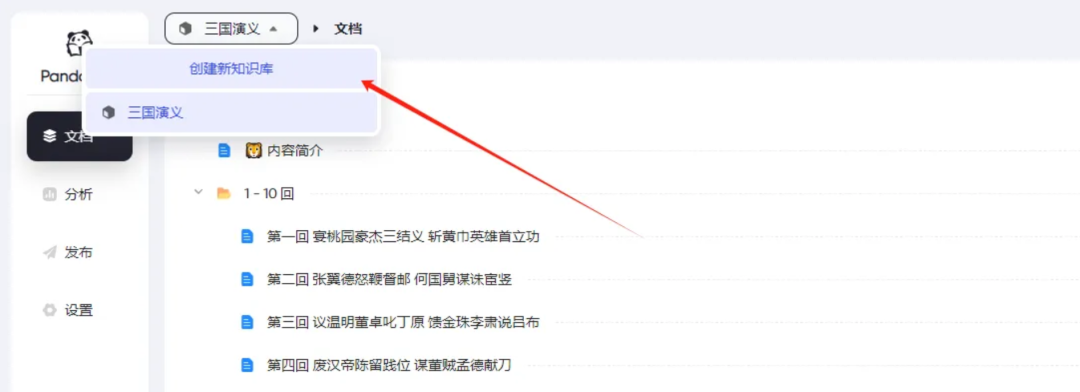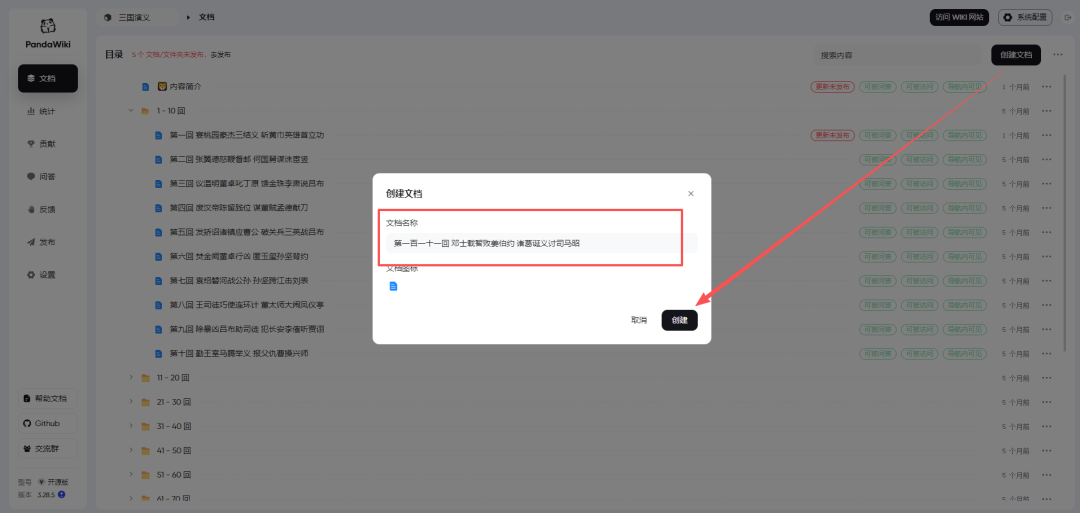 上面我们创建好了一个名为:三国演义的知识库,接下来我们为知识库创建并完善对应的文档: