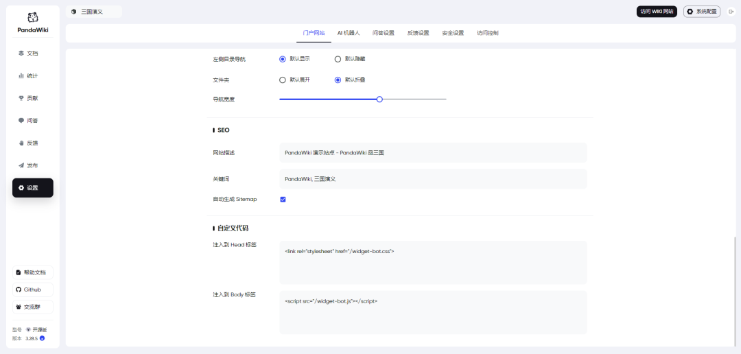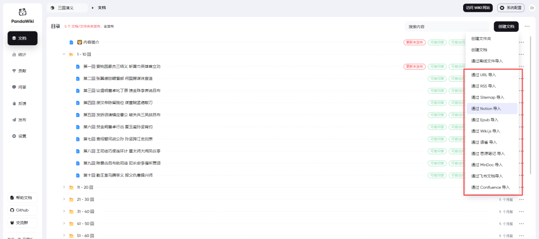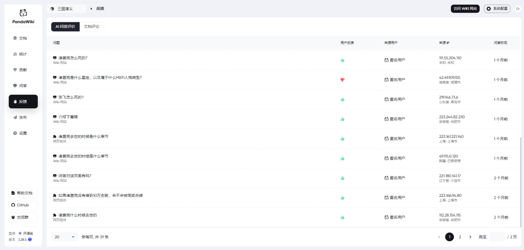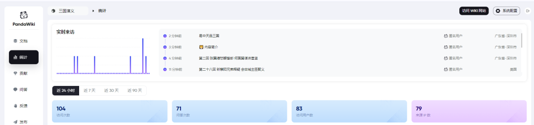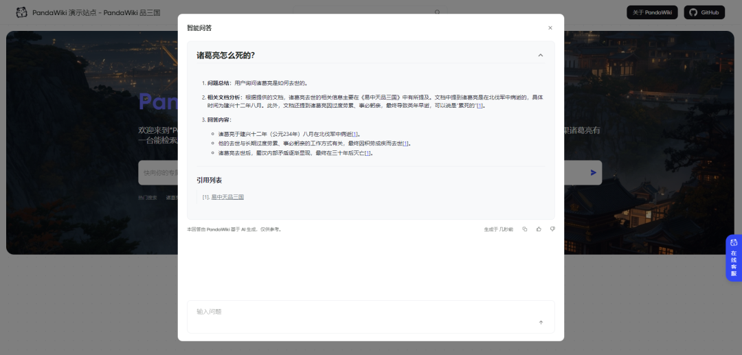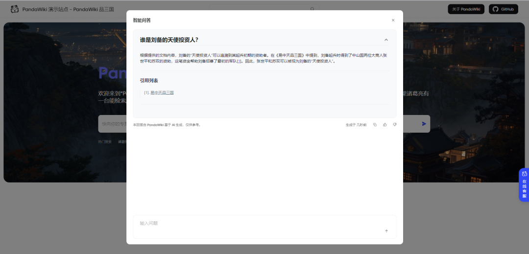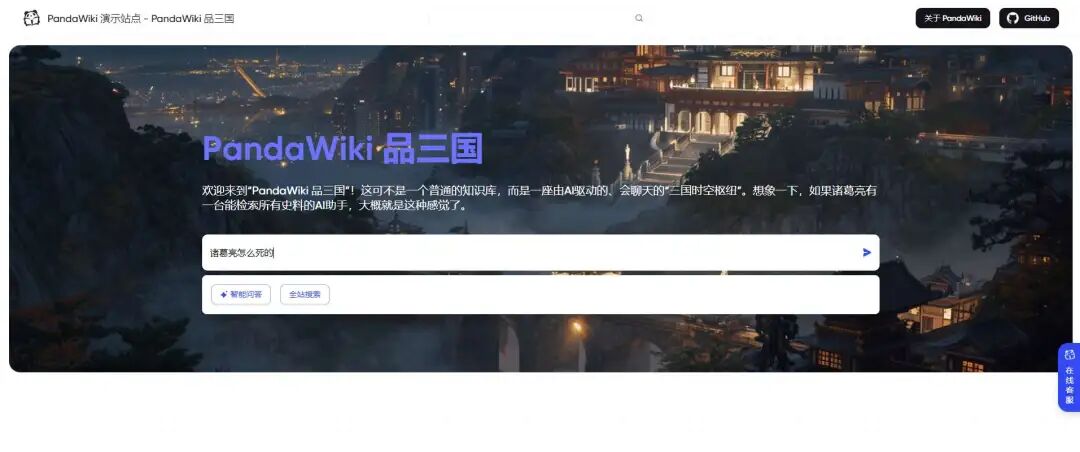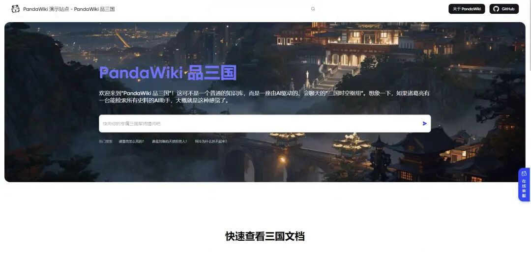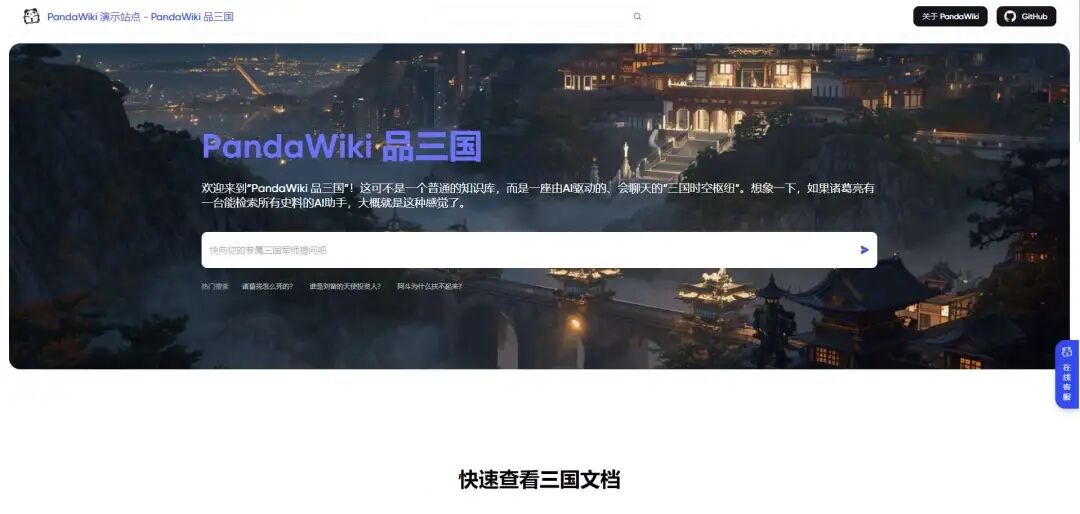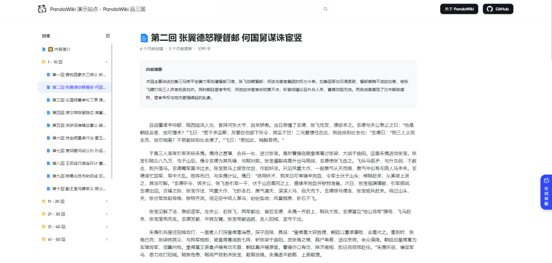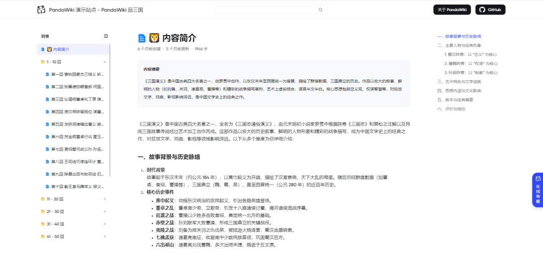 下面我们一起来看看使用PandaWiki快速构建的三国演义知识库: