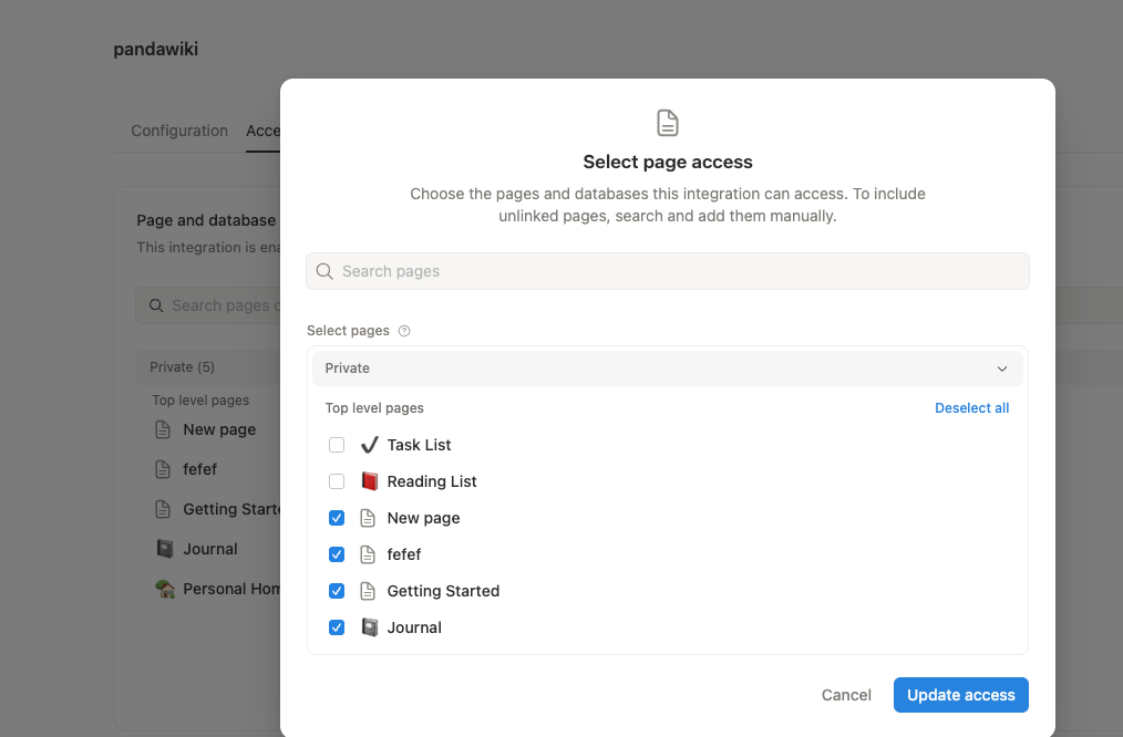 配置成功后,将 Integration Secret 复制到 PandaWiki 中。系统会自动拉取 Notion 文档列表,你可选择需导入的文档标题,PandaWiki 将其内容转换为可编辑的富文本格式并保存为本地文档。