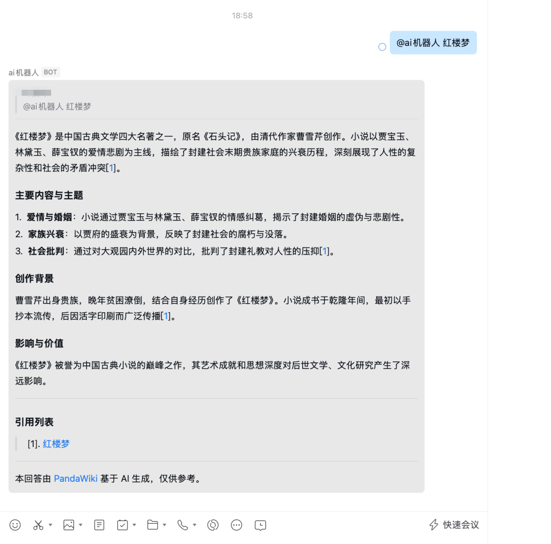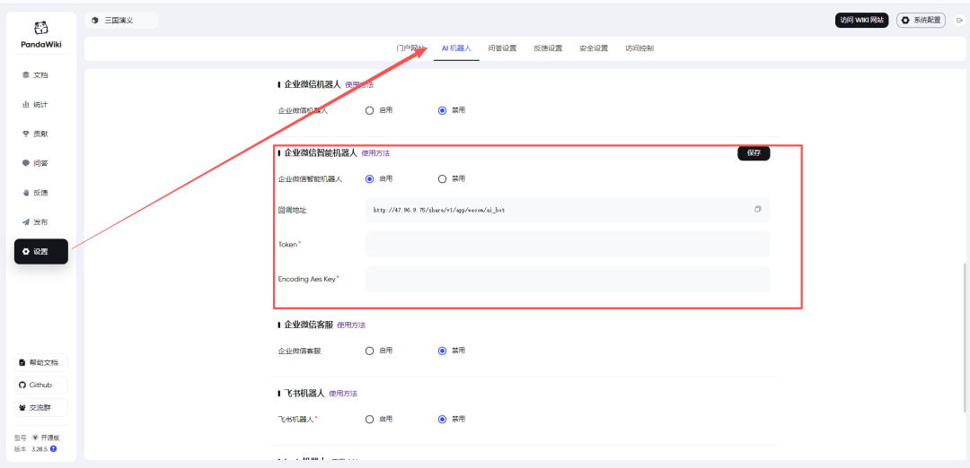配置企业微信机器人及 PandaWiki 后台后保存: