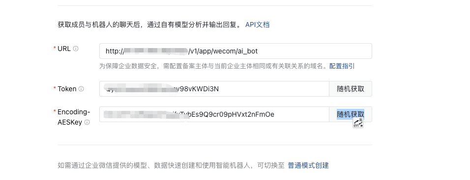 复制PandaWiki上的回调地址填入企微信后台 URL 并保证两边 token 和 Encoding Aes Key 一致。