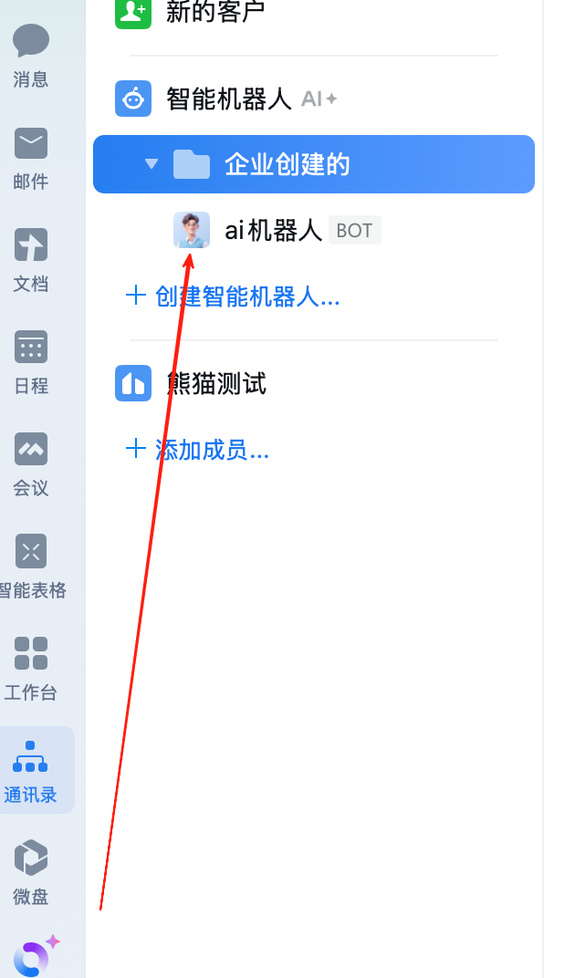 我们进入企业微信后台=>管理工具=>选择创建智能机器人: