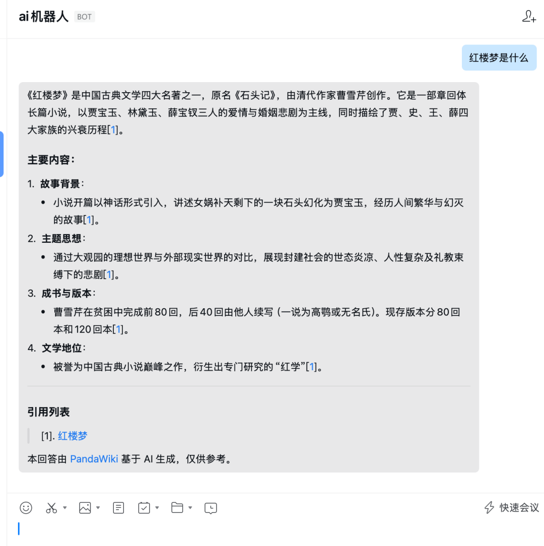 PandaWiki 是一款基于 AI 大模型驱动、开源免费(采用 AGPL-3.0 开源协议)、功能强大的知识库搭建系统,旨在帮助企业或者个人开发者快速构建智能化的产品文档、技术文档、FAQ、博客系统等。并且借助 AI 大模型的力量为用户提供了 AI 创作、AI 问答、AI 搜索等能力,极大地提升了知识管理的效率和智能化水平。可与钉钉、飞书、企业微信等主流聊天机器人平台无缝集成,实现知识的即时共享与便捷查询。