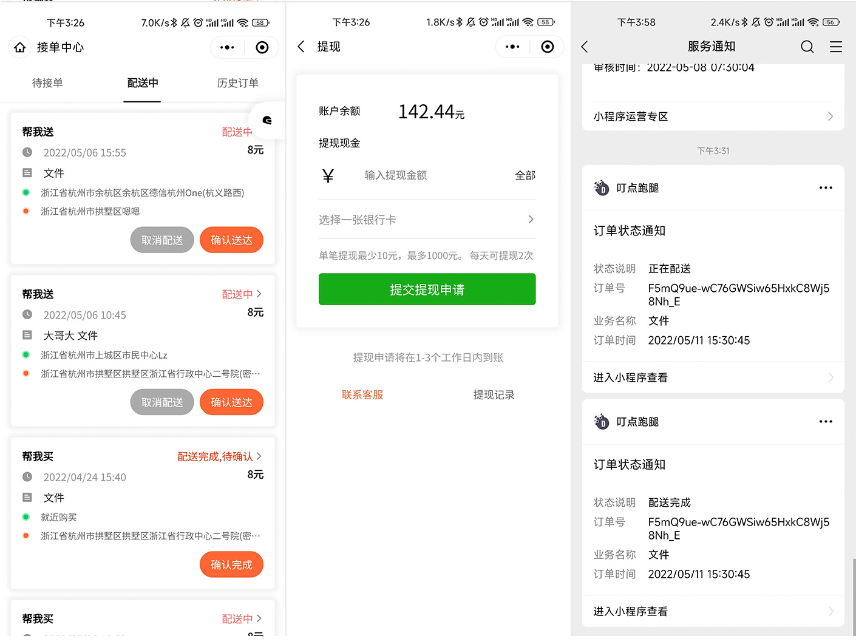 帮送服务: 用户可以选择需要配送的物品类型、重量、距离等信息,并下单等待骑手接单。 -