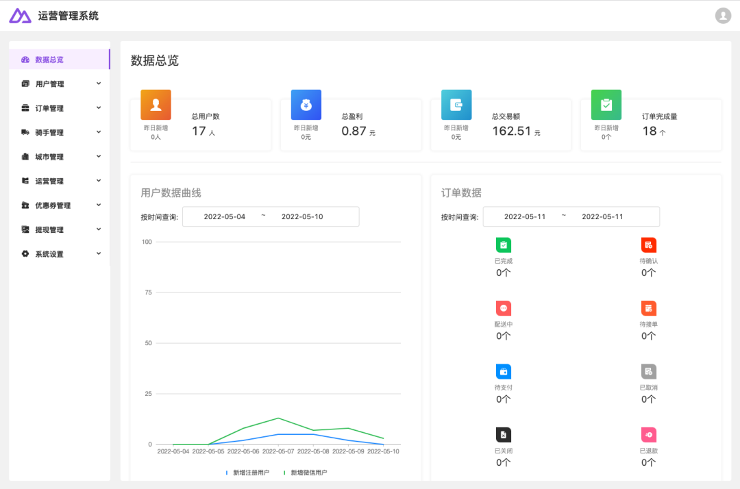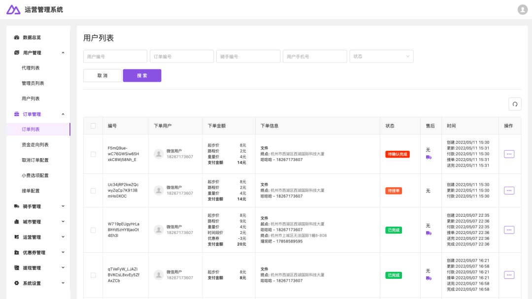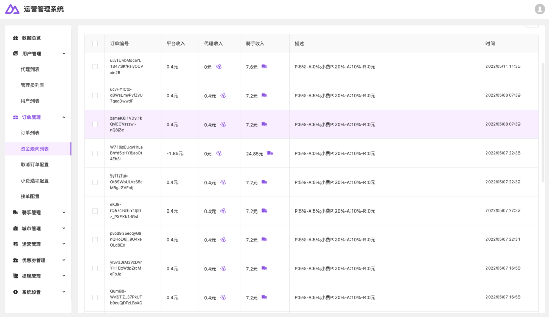 资金走向: 后台可以查看和管理平台的资金流动情况,包括用户充值、提现、骑手收入等。 -