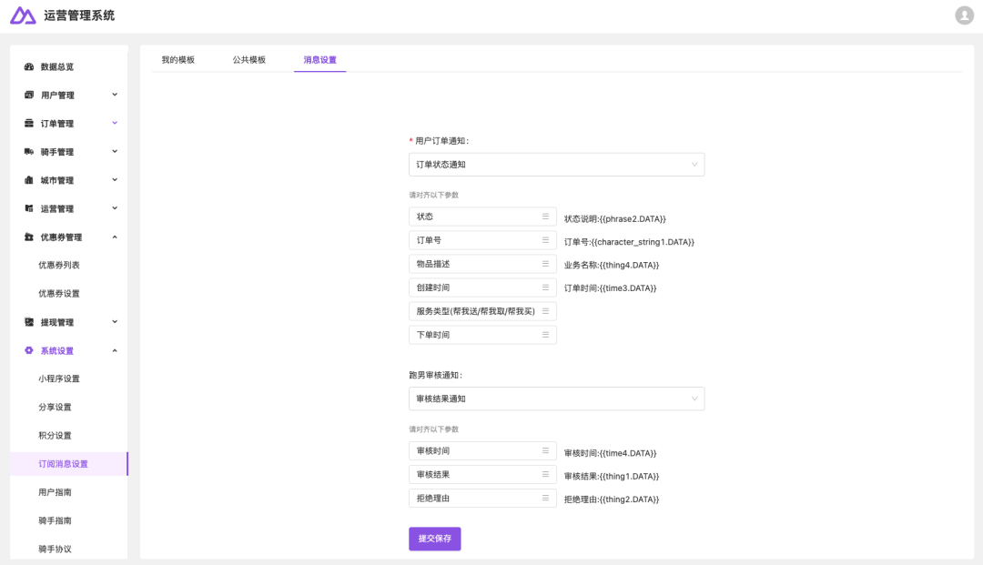 订阅消息: 后台可以配置和管理订阅消息,向用户发送订单状态变更、优惠活动等通知。 -