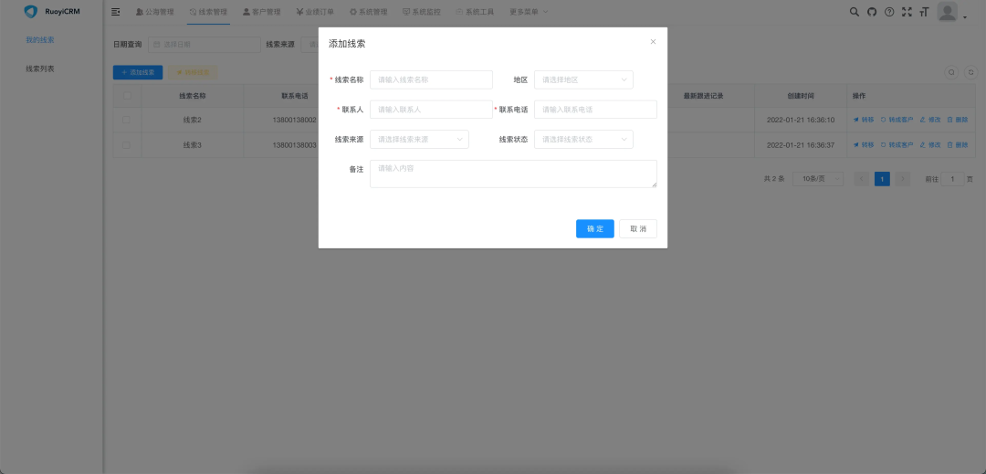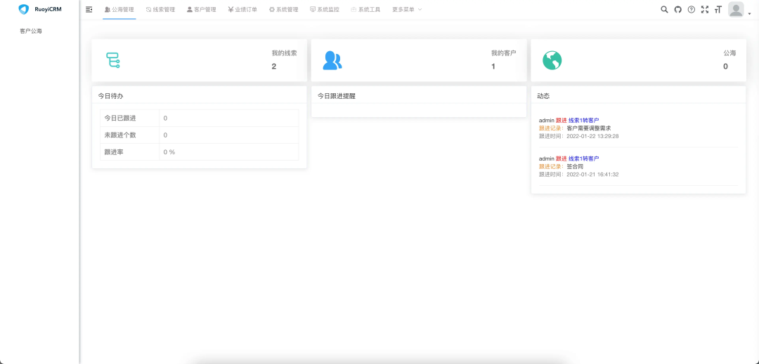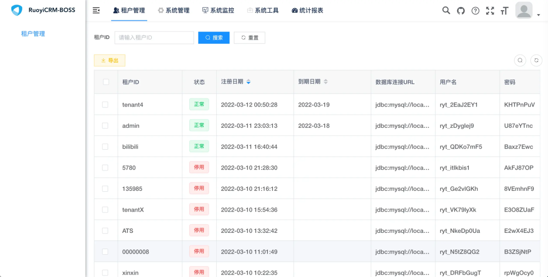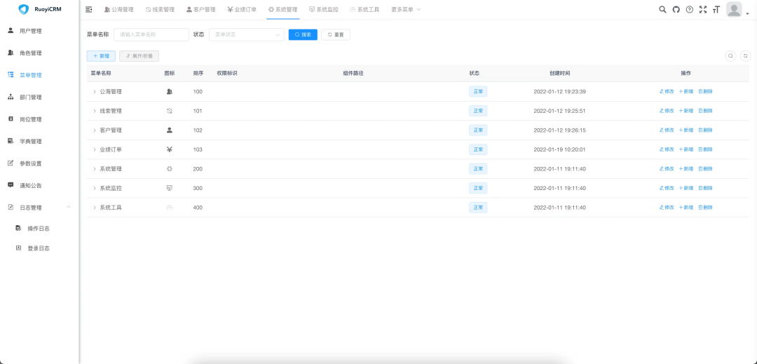 RuoyiCRM 是一款基于若依 Vue 平台搭建的多租户开源 CRM(客户关系管理)系统。该系统以 SaaS(软件即服务)方向实现多租户功能,支持动态创建数据库,并采用独立数据库的安全级别,实现物理数据库隔离,而非简单的字段隔离。