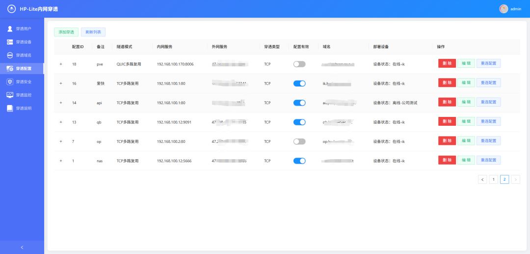 映射配置:提供映射配置的启用和禁用功能,便于临时关闭穿透服务。