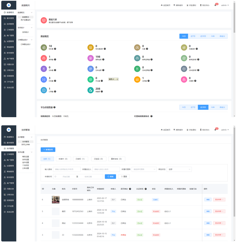 包含用户端、技师端、总后台、代理商、分销员