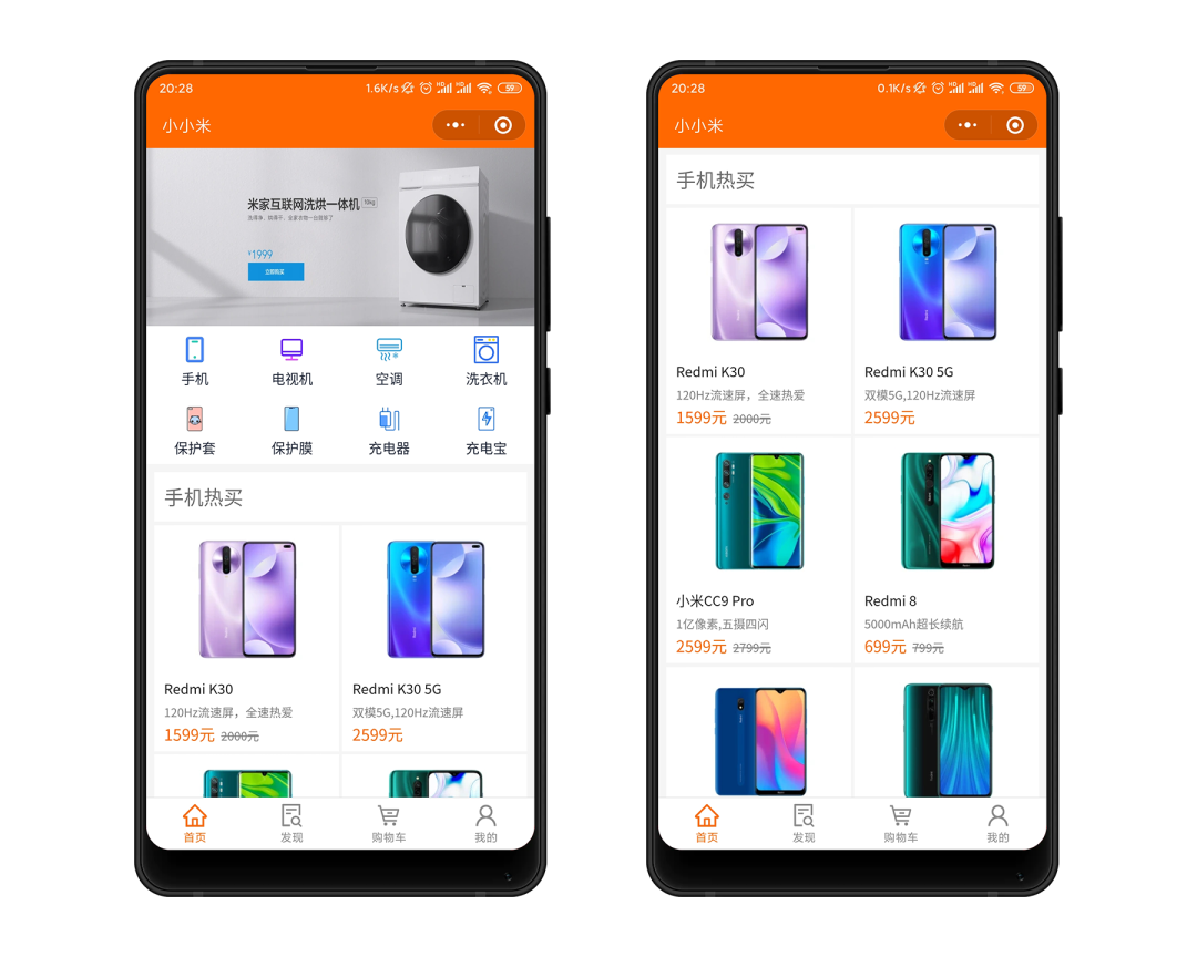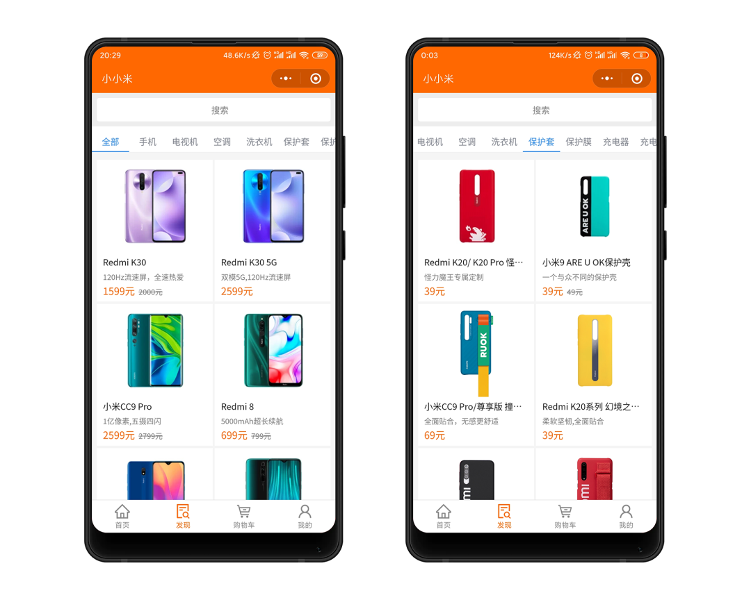 小程序项目包含4个tabBar:首页、发现页(即商品展示页)、购物车、我的。另有商品详情页、我的收藏、订单结算页面、我的订单。实现了商品的展示、商品分类查询、关键字搜索商品、商品详细信息展示、用户购物车、订单结算、用户订单、用户收藏列表。