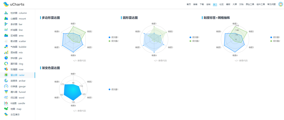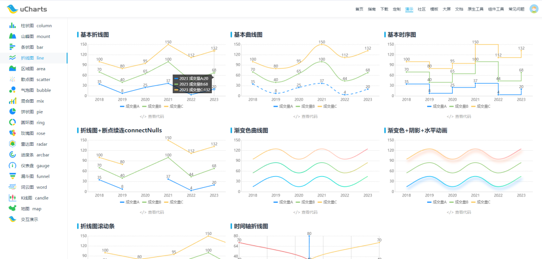 uCharts 是一款基于 canvas API 开发的,适用于所有前端应用的图表库。开发者只需编写一套代码,即可运行到 Web、iOS、Android(基于 uni-app / Taro)、以及各种小程序(微信、支付宝、FinClip、百度、头条、飞书、QQ、快手、钉钉、淘宝)、快应用等更多支持 canvas API 的平台。uCharts 致力于提供高性能、跨平台的图表解决方案,帮助开发者快速构建数据可视化应用。