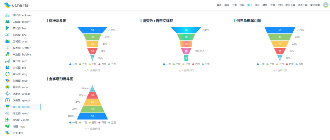 漏斗图: 展示数据在不同阶段的转化情况。 -