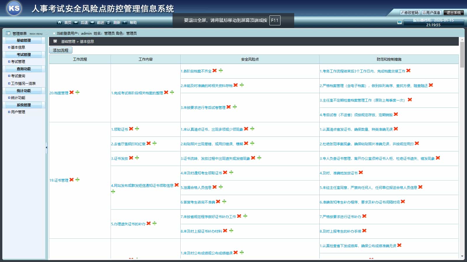 1、基本信息,考试过程中流程发布。包括工作流程、工作内容、安全风险点、防范和控制措施。