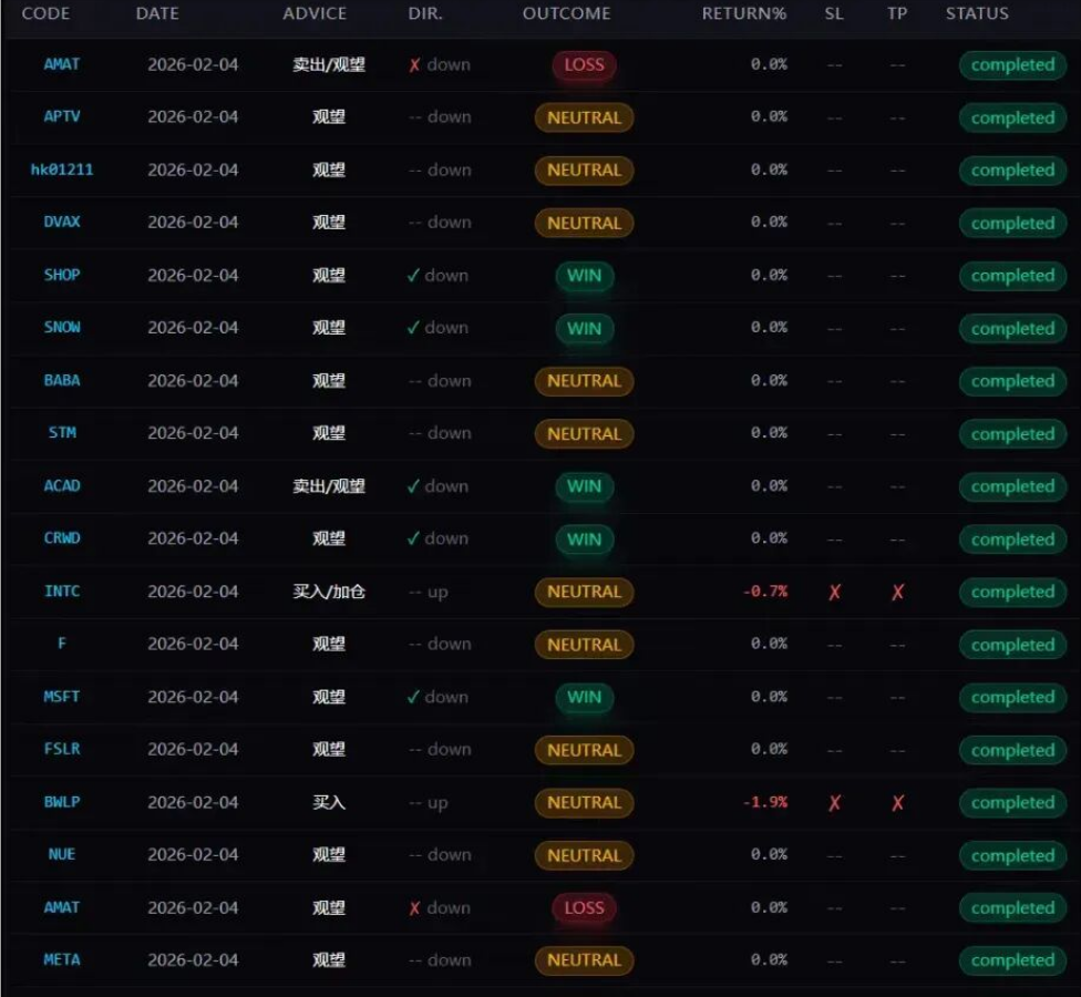 历史分析准确率:自动评估历史分析的准确率,包括方向胜率、止盈止损命中率。