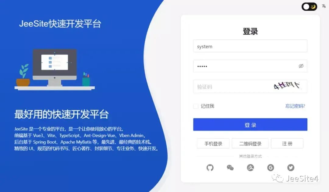 JeeSite 是一个开源免费、轻量级、支持国产化的 Java 低代码快速开发平台。它不仅仅是一个后台开发框架,而是一个企业级快速开发解决方案。JeeSite 基于经典组合 Spring Boot、Shiro、MyBatis 构建后端,前端采用分离版 Vue3、Vite、Ant Design Vue、TypeScript 等最先进技术栈,或者 Beetl、Bootstrap、AdminLTE 经典开发模式。该平台提供了在线数据源管理、数据表建模、代码生成等功能,能够自动创建业务模块代码工程和微服务模块代码工程,显著提升开发效率。