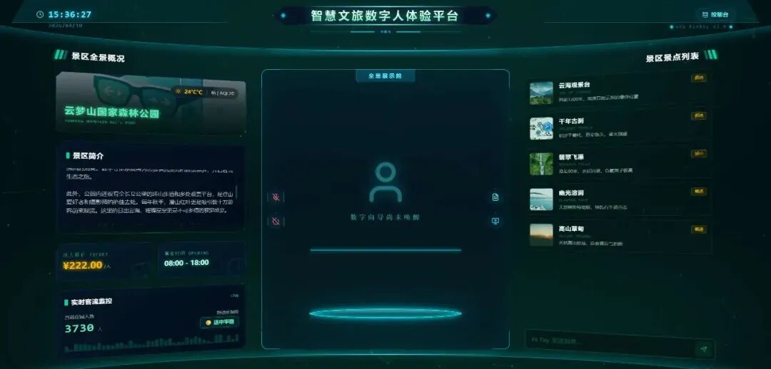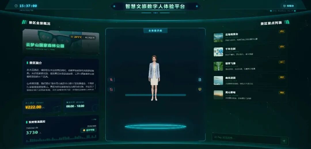 该项目以 Fay 数字人服务和魔珐星云 3D 渲染 SDK 为核心,提供沉浸式的景区全景概览、实时客流监控、景点本地图片上传管理以及与 3D 伴游向导互动的综合性解决方案。